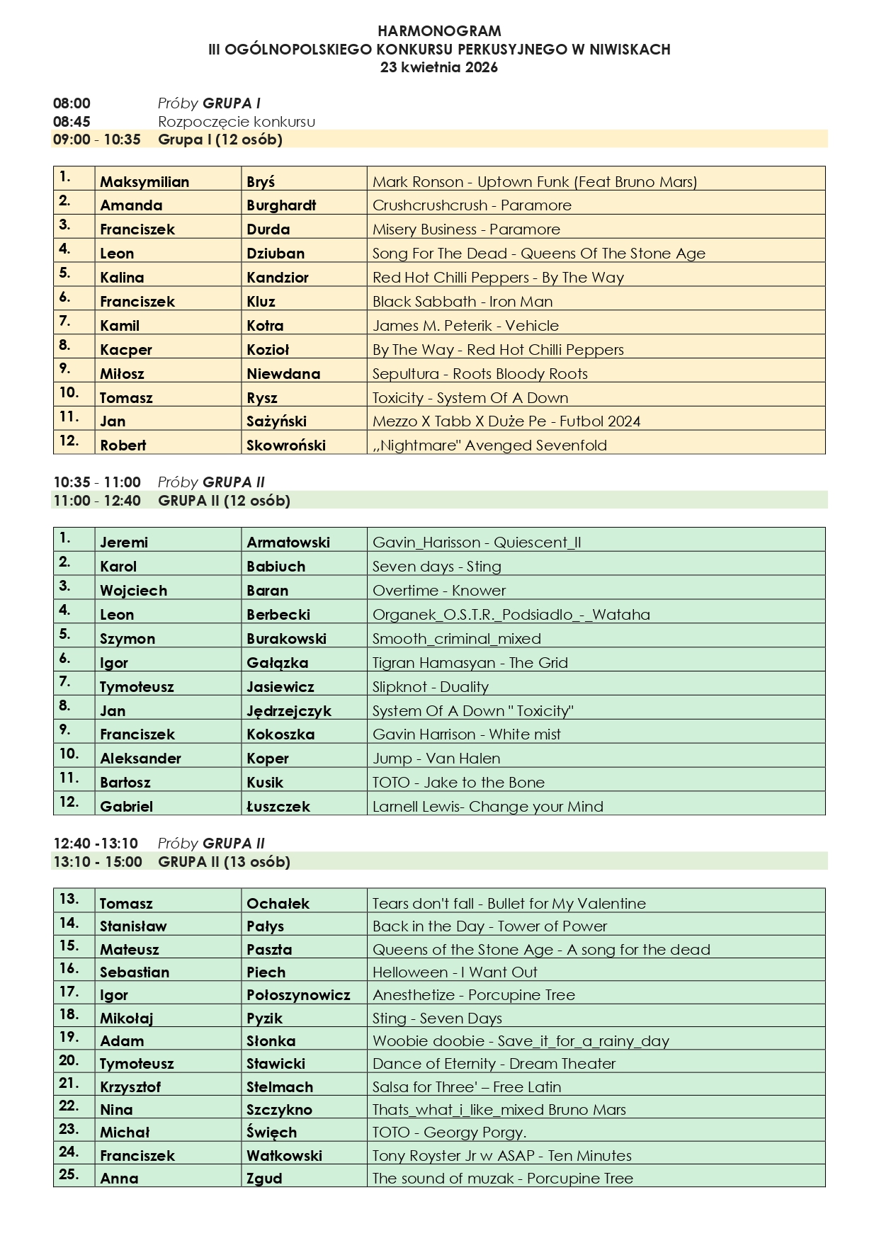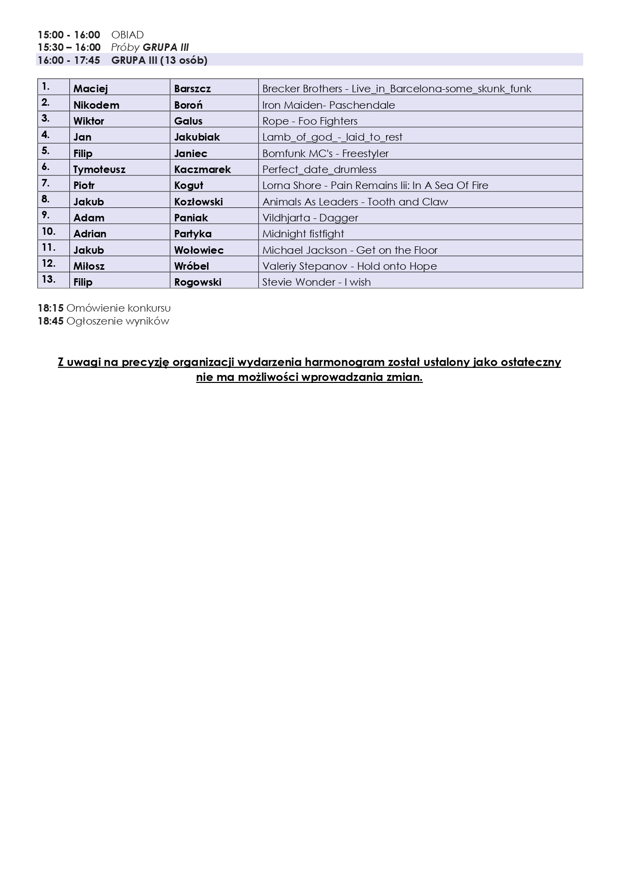 Bardzo prosimy, aby w treści maila z załączonym potwierdzeniem wpłaty napisać imię i nazwisko uczestnika oraz tytuł utworu wykonywanego w drugim etapie.
